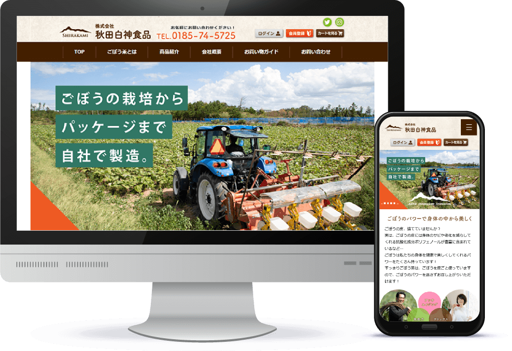保険会社様からのご紹介で、秋田県三種町にあるごぼう茶のネット通販サイトのリニューアル制作のお手伝いをさせていただきました。ウェブデザイン、ショッピングカートの構築、現場撮影とレストランの貸し切り、畑や製造機械での体験、商品の取材やライターと一通りの作業。